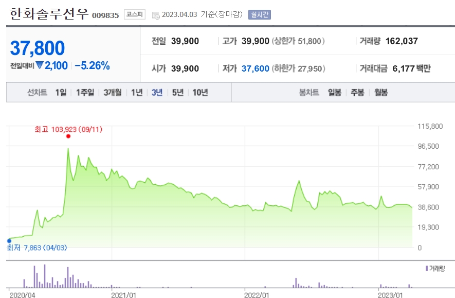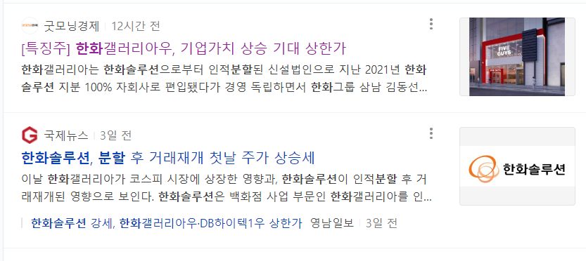 3월 31일 한화솔루션에서 한화갤러리아가 9대 1 비율의 분할 상장 한 이후 신재생에너지 산업에 대한 집중이라는 기대심리 때문인지 장 초반에는 한화솔루션우가 48,800원까지 상승하였습니다. 하지만 한화갤러리아가 상승세를 보이는 반면 한화솔루션과 한화솔루션우는 곧바로 하락하는 모양새를 보였습니다. 특히 한화갤러리아우는 4월 3일 오늘까지 2 연상을 기록한데 비해 한화솔루션우는 2 영업일만에 한 달 전인 분할 전의 가격보다 더 떨어진 지금의 상황이 한화솔루션우를 손실 보유하고 있는 주주인 저는 매우 아쉬울 따름입니다.