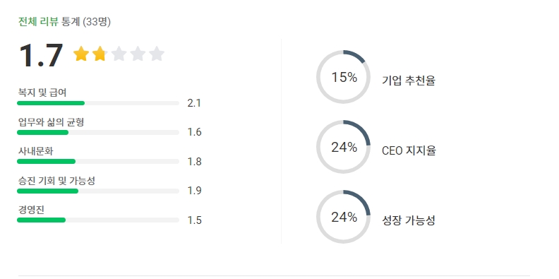 또한 에이프로의 사업보고서를 보며 2000년에 회사 설립된 것에 비교하여 임직원들의 평균 근속 년수가 적다는 느낌을 받았습니다. 갑작스레 사업규모가 커져 신규 입사자들이 늘었다는 것을 감안하고 기업 평가 플랫폼 '잡플래닛'에 에이프로를 검색해 보았습니다. 그런데 에이프로 회사에 대한 점수가 좀 낮더라고요. 중소기업이라 어쩔 수 없다고 생각해도 아쉬운 느낌에 장기 투자 종목으로써는 약간 위험하다는 생각이 들었습니다.