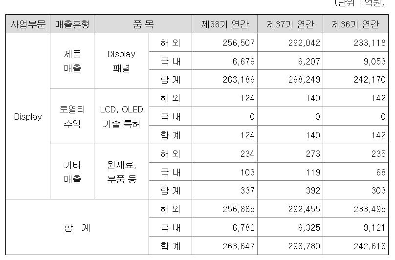 LG디스플레이는 디스플레이 단일 사업부로 구성되어 LCD와 OLED 기술을 활용하여 디스플레이 제품을 생산, 판매하는 비즈니스 모델을 가지고 있습니다. 국내보다는 유럽을 비롯한 해외 시장에 매출의 대부분을 구성하고 있으며 TV와 IT 제품이 매출에 상당 부분을 차지하고 있습니다.