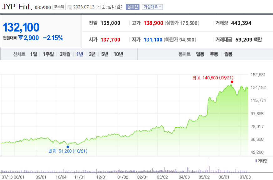 이 날 와이지엔터테인먼트의 주가는 7만 2,000원까지 떨어져 전날 대비 8%까지 급락하는 모습을 보여주었으나 다행히 5.8% 하락한 7만 4,300원에 12일을 마감하였고, 오늘인 13일 또한 전일과 동일한 7만 4,300원으로 마감하였습니다.