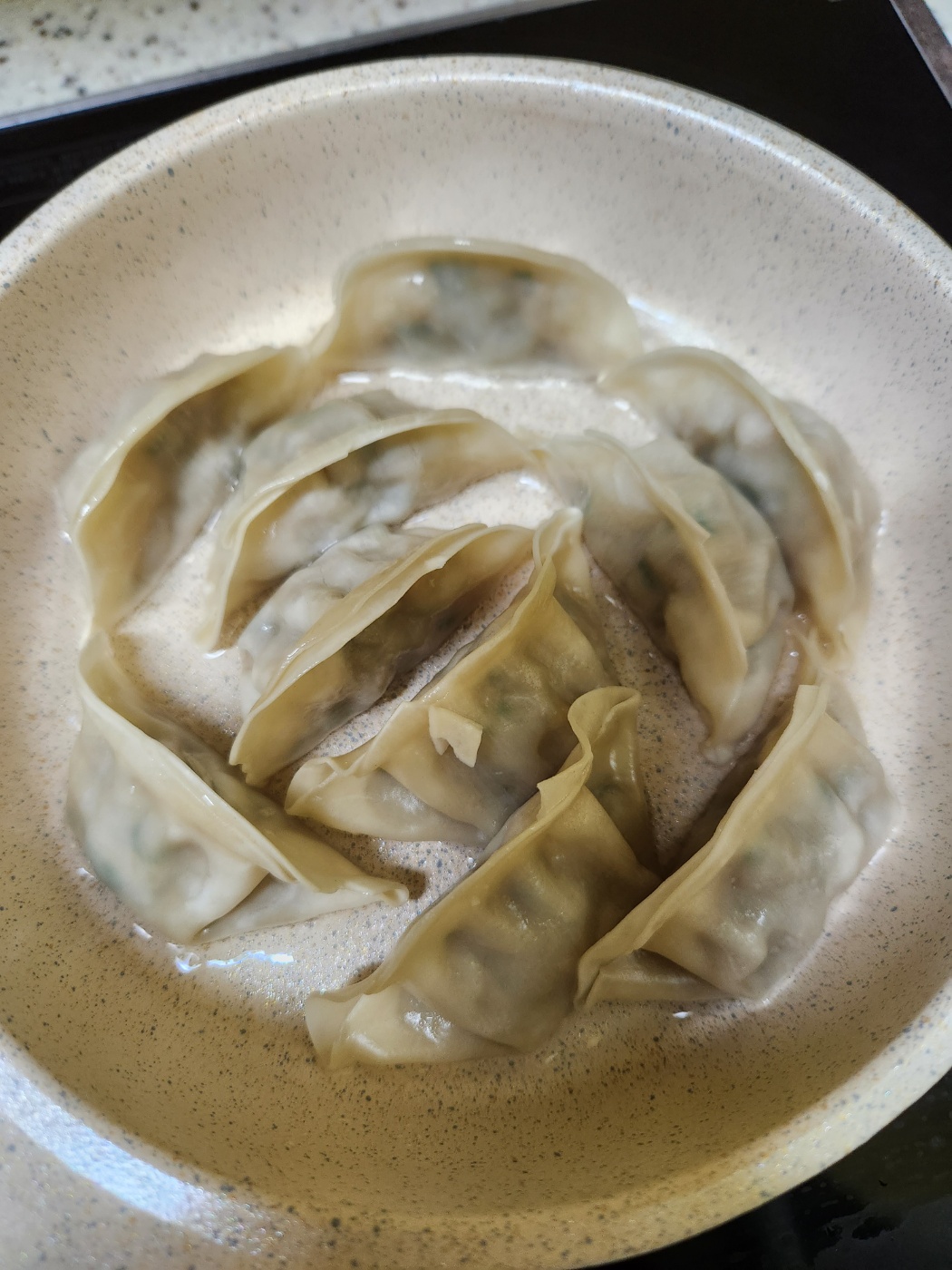 1. 기름두른 프라이팬에 만두의 바닥 부분이 닿도록 올립니다.