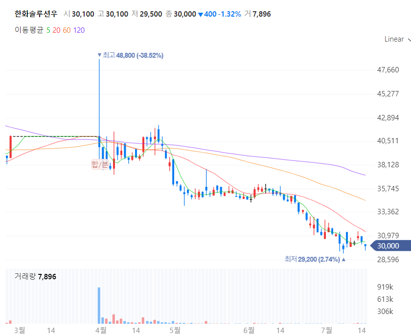 한화솔루션우의 주가는 지난 4월 한화갤러리아와의 분할 이후 지속적으로 하락하고 있습니다. 특히 지난 7월 6일에는 3만 원대를 뚫고 하락하여 2만 원대까지 떨어지는 것을 보며 한화솔루션우의 투자자들의 실망감이 이만저만 아니었습니다.