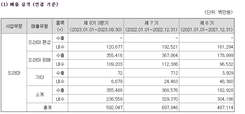 2023년 3분기까지의 드라마 판매 부분 매출은 수출 3,500억, 내수 1,009억으로 2022년보다 높은 매출 달성이 가능할 것으로 보입니다.