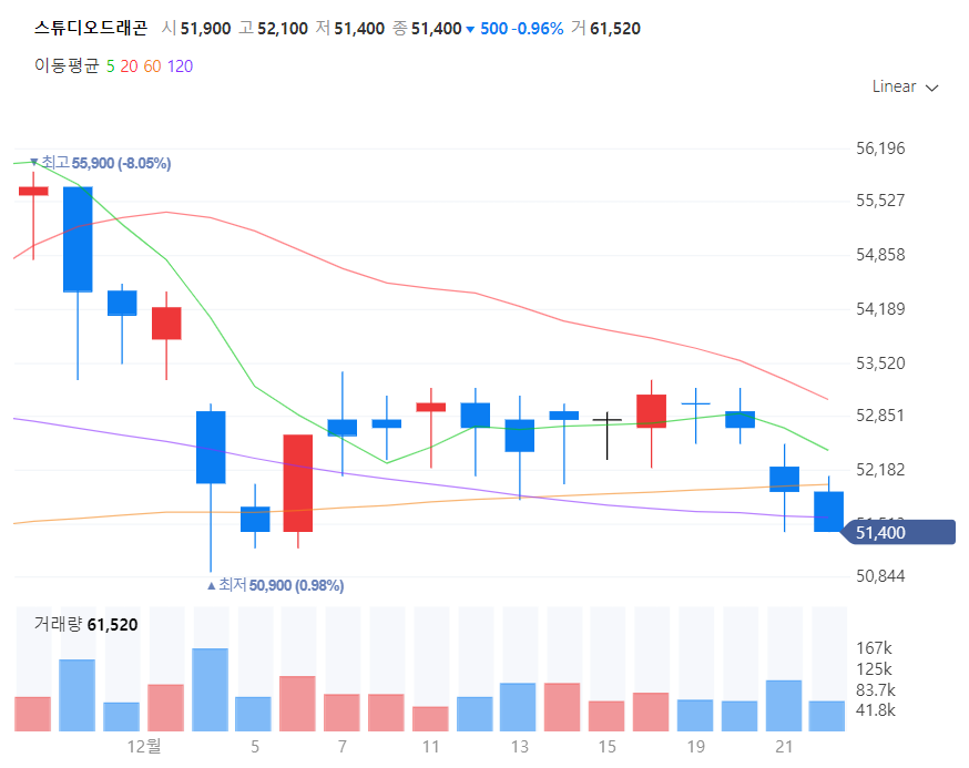 이에 대한 파급효과 때문인지 상장 2021년 이후 지속적으로 하락세였던 스튜디오드래곤 주가는