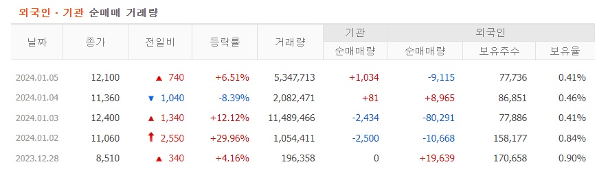 24년 첫 개장일인 2일에 29.96%를 보인 후 4일 8.39% 하락을 보였으나 마지막 개장일인 5일 다시 6.51%의 상승을 보여주며 상승 가능성을 아직 열어두고 있습니다.