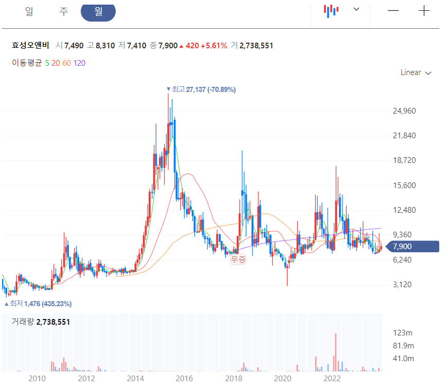또한 효성오앤비의 현재 주가는 2008년 4월 코스닥 상장 이후 하방권을 보이고 있으며 2015년 최고가였던 39,600원에 비교하면 약 5분의 1 가격으로 상당히 낮은 가격대를 형성하고 있습니다.