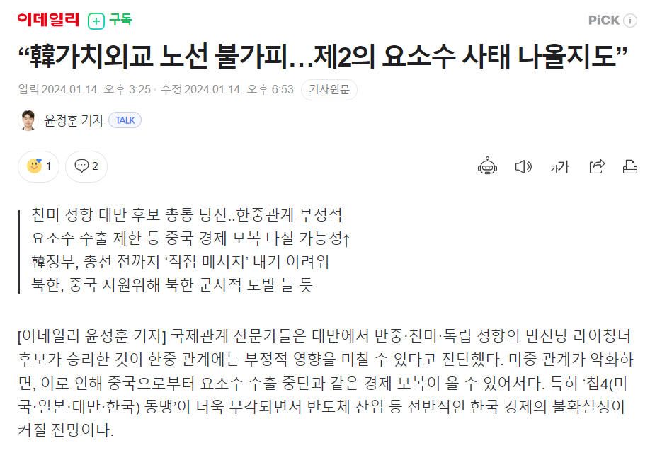 이번 대만의 선거에서 반중·친미·독립 성향의 민진당 라이칭더 후보가 승리하였습니다.