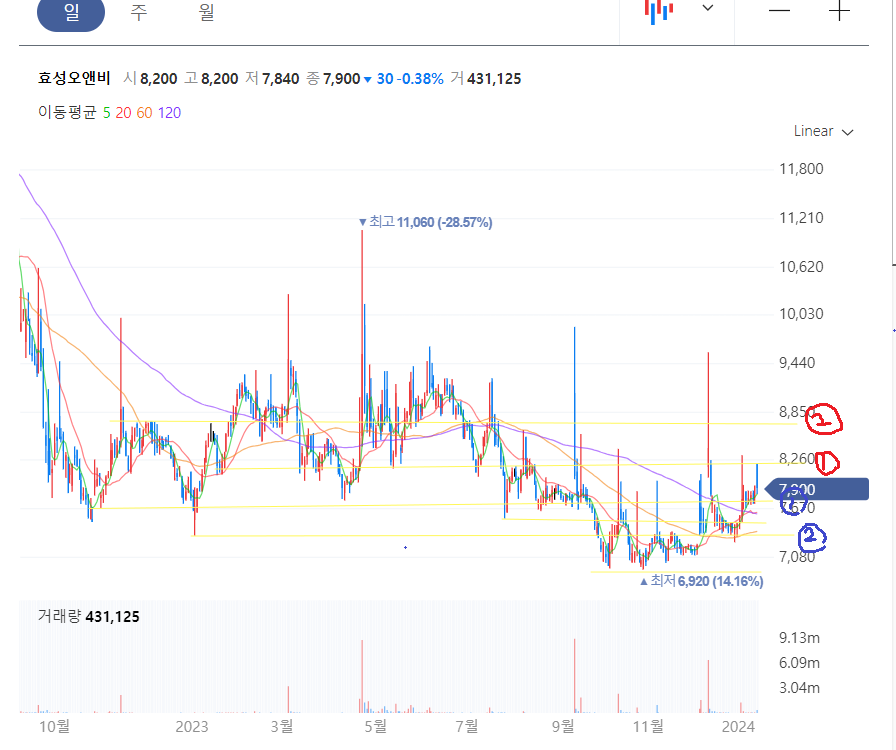 효성오앤비 차트 분석, 오랜 다지기 이제는 상승?