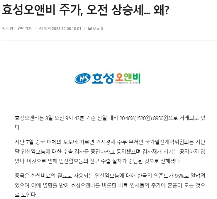 때문에 작년 12월 초에는 중국 거시경제 주무 부처인 국가발전개혁위원회의 인산암모늄에 대한 수출 검사 중단 통지로 인해 효성오앤비의 주가가 급상 했던 적이 있습니다.