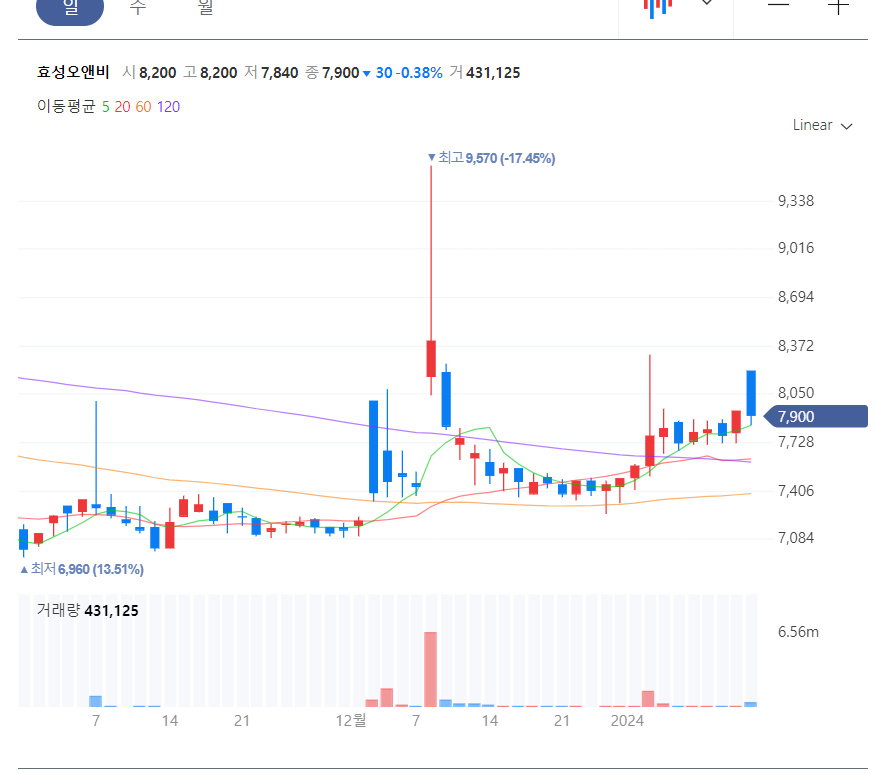 23년 12월 8일 효성오앤비의 주가가 9,570원까지 상승하였고, 거래량 또한 655만주로 전일 11만 주와 비교하면 60배 가까이 급증한 거래량을 보여주었습니다.