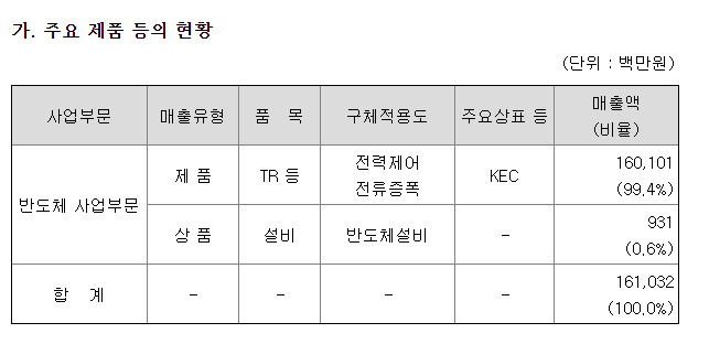 KEC는 비메모리 전력 반도체를 중심으로 하여 반도체 제품 및 부품 제조업을 영위할 목적으로