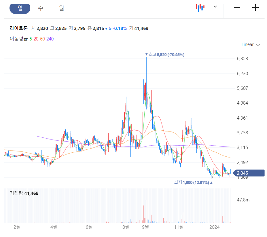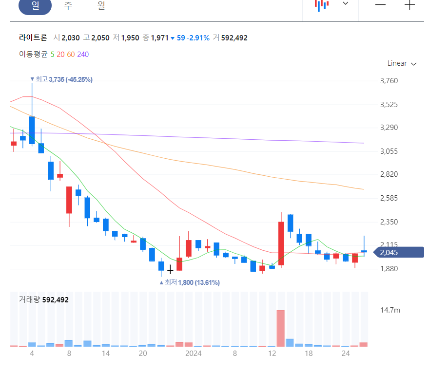 라이트론의 주가 역시 계속 하향세를 보여주다 23년 12월 1,800원까지 떨어졌었던 주가가 24년 1월 15일에 24.6%의 상승을 기록하며 2,345원까지 올랐었습니다.