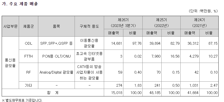 회사는 또한 10G Cooled 광모듈 제품군 확대, 40G FTTH 광모듈 제품군 확대 등의 신규 사업을 추진 중이며