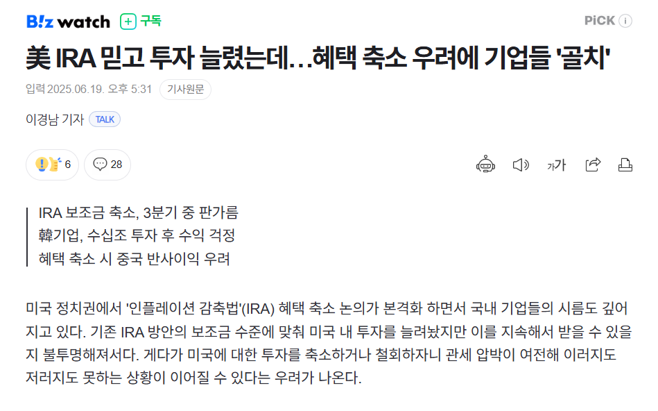 ⚠️ 미국 상원에서 IRA(인플레이션 감축법) 태양광·풍력 세제 혜택을 조기 폐지하거나 축소하는 법안 추진 중