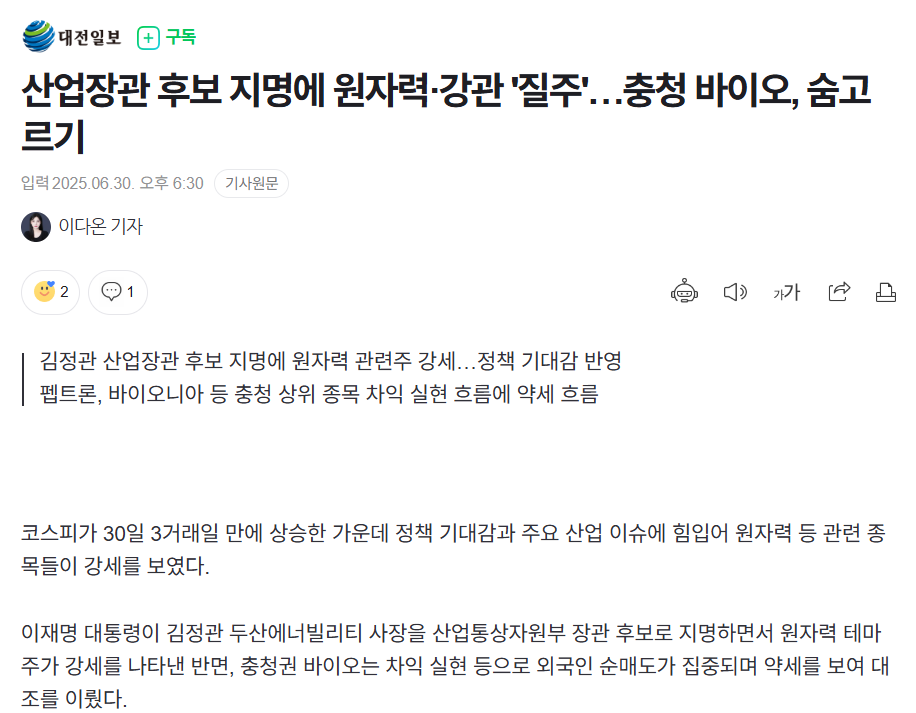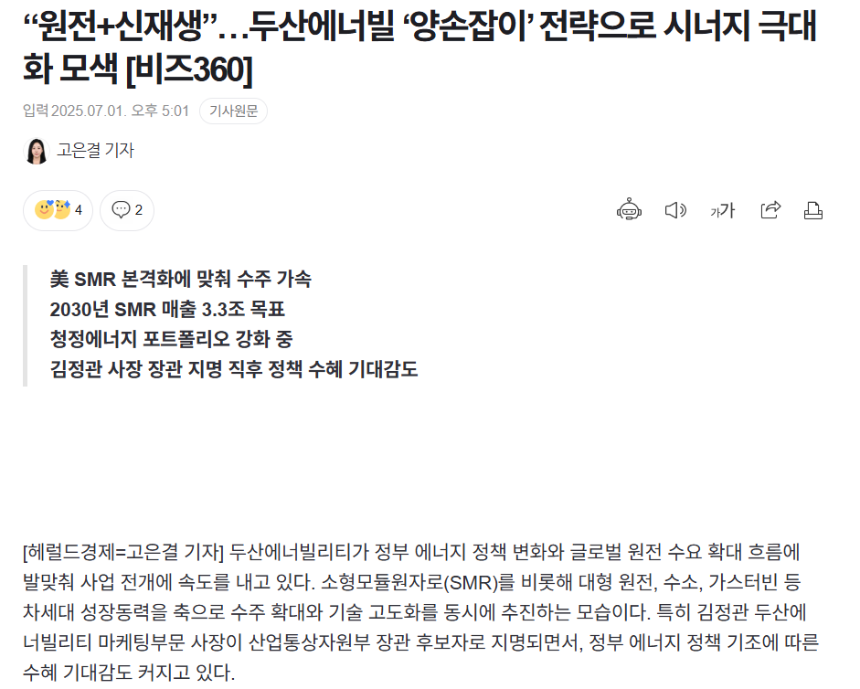 • 6월 30일, 김정관 두산에너빌리티 사장이 산업통상자원부 장관 후보자로 지명된 이후 장 초반 9%대 급등, 52주 신고가 경신 (7만2200원 → 최고 7만4100원) .