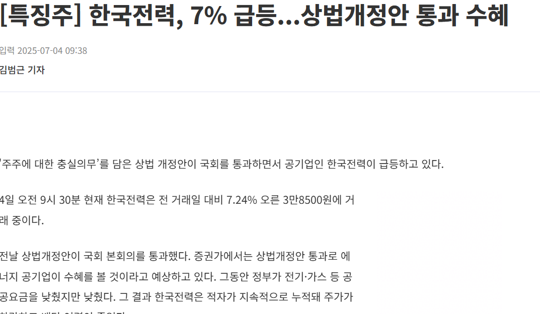 - 최근 보도에 따르면 원전, 상법개정안 테마가 부각되며 주가가 강세를 보임