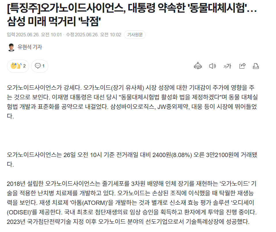 • 6월 줄기세포치료제 테마 강세, 오가노이드사이언스 +14% 급등.