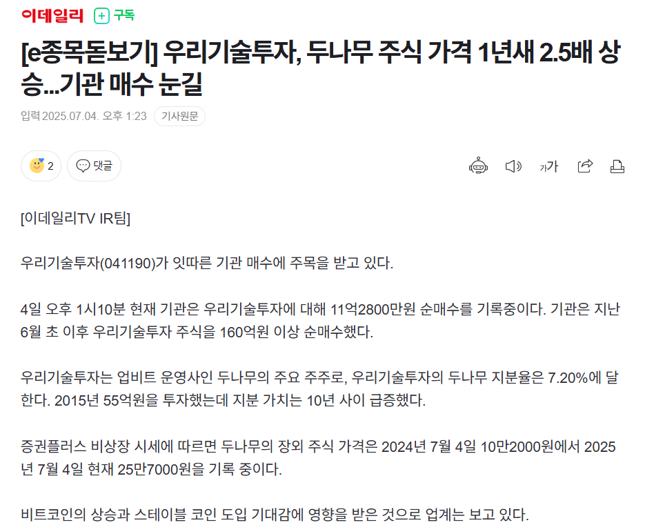 만약 두나무가 실제로 디지털자산 기반 생태계를 확장하고 수익성을 확보한다면, 우리기술투자 역시 지분가치 상승을 통해 간접적인 수혜를 받을 수 있습니다.