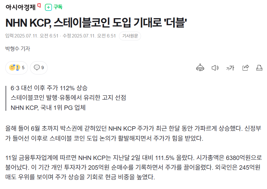 2025년 7월 초 NHN KCP의 주가는 단숨에 시장의 중심으로 부상했다. 스테이블코인 테마의 선두주자로 급부상하며, 불과 3영업일 동안 40% 이상 급등, 11일에는 장중 한때 16% 가까운 상승률을 기록했다. 이 과정에서 개인 투자자의 순매수세가 집중되며, 단기 트레이딩 수요도 몰리고 있다. 거래량도 폭증하며 52주 신고가를 경신했다.